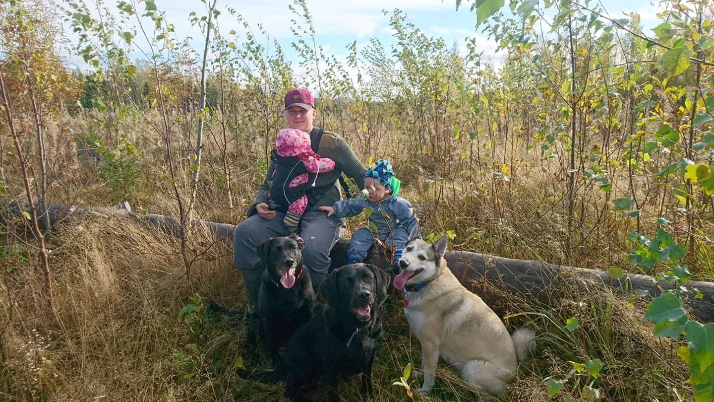 Kasvatan käyttölinjaisia labradorinnoutajia pienimuotoisesti perheen keskellä.